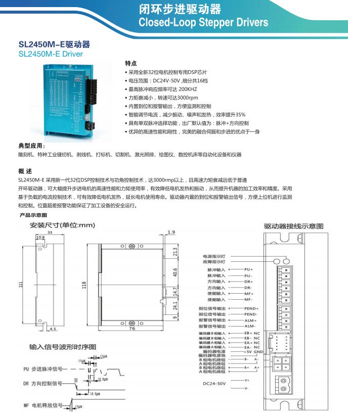 描述: SL2880-E 采用新一代32位DSP控制技術(shù)與功角控制技術(shù),達(dá)3000rmp以上,且高速力矩衰減遠(yuǎn)低于普通開環(huán)驅(qū)動器,可大幅提升步進(jìn)電機的高速性能和力矩使用率,有效降低電機發(fā)熱和振動,從而提升機器的加工效率和精度。采用基于負(fù)載的電流控制技術(shù),可有效降低電機發(fā)熱,延長電機使用壽命。驅(qū)動器內(nèi)置的到位和報警輸出信號,方便上位機進(jìn)行監(jiān)測和控制。位置超差報警功能保證了加工設(shè)備的安全運行。